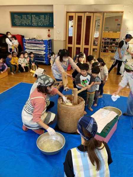 お遊戯場でにじ組・たいようぐみが本物の杵と臼を使って餅つきをしました!